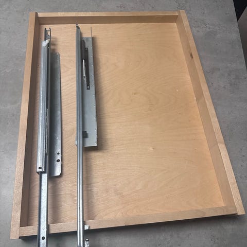 Uttrekkbar hylleplate, hvitbeiset eikemønster. Med 2 skinner.