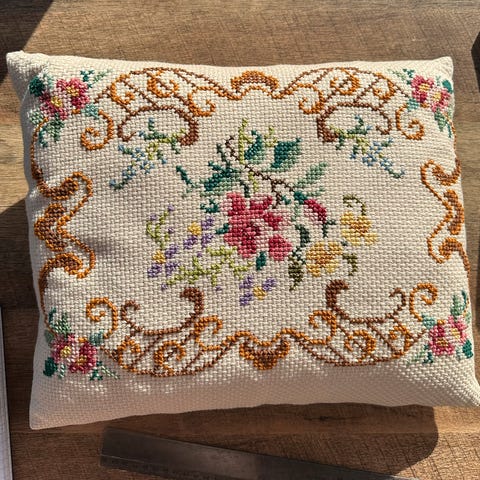 Pen brodert pyntepute. Ser i utgangspunktet hel og fin ut men har noen få små hull på baksiden og en ørliten flekk på fremsiden. Selges derfor billig.