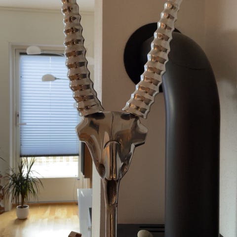 Metallfigur i form av en antilope med lange horn. Kun stått på hylle og har ingen skader
