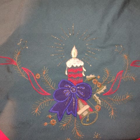 Juletreduk selges. Bruksmerker forekommer men har ingen betydning for bruken som juletreduk i mine øyne. Diameter 100 cm. Kan sendes med posten porto 73 kr.