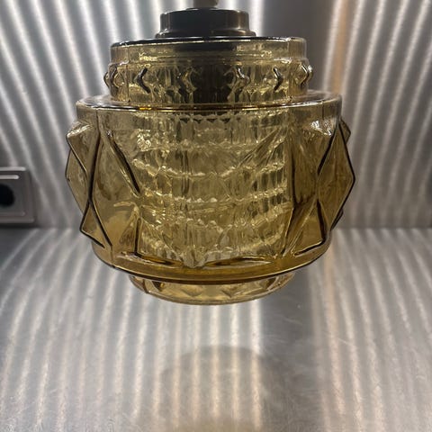 elger en vintage pendellampe i kraftig ravfarget pressglass, trolig fra 1960–70-tallet.