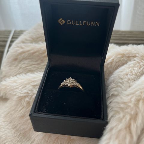 Gull ring med 10 små diamanter og en større i midten.
