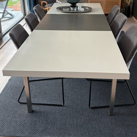 Selger spisebord fra Bolia. Bordet er solid, med matt hvit overflate og understell i eik. Understell kan skrus av ved transport.