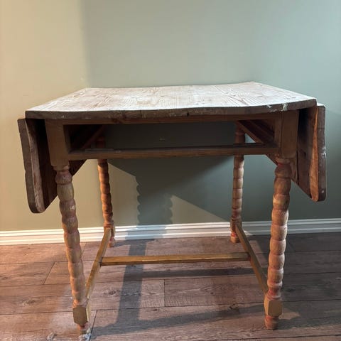 Gammelt kjøkkenbord og 2 pinnestoler,