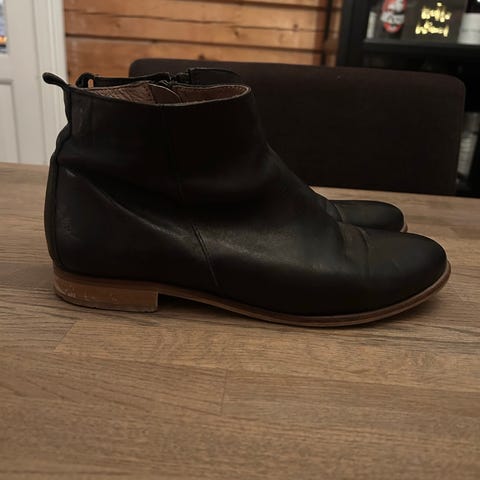 Bianco støvler i størrelse 39 laget av svart mykt skinn. Støvlene har en høy skaft med spenne-detaljer og en lav hæl. Under oppbevaring har det skjedd noe med den ene støvelen, men mener , om man går til en skomaker og kutter av den med spenne, kan den fortsatt brukes. Jeg passer ikke de lenger, hadde de gjort det, hadde jeg fikset de.