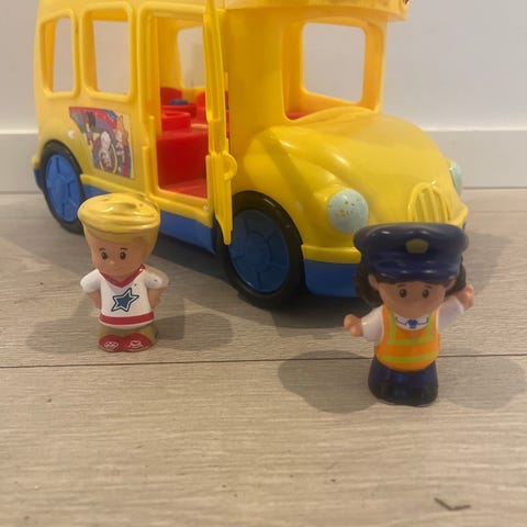 Lekebuss for barn i plast. Gul buss med blå hjul og røde detaljer. Inkluderer to figurer, en sjåfør og en passasjer. Designet for lek og rollelek. Kommer med batteri og gir ut lyder.