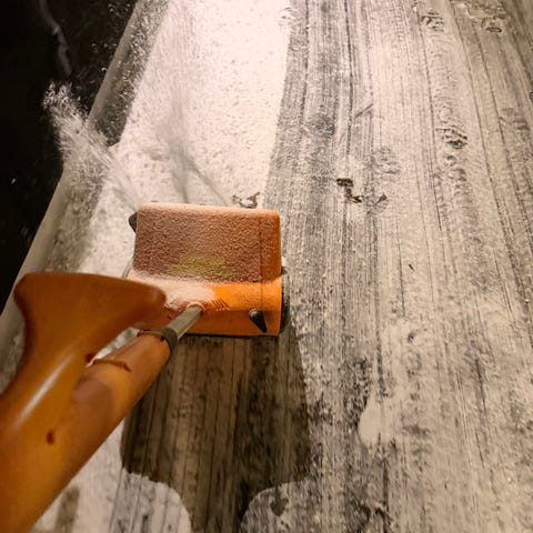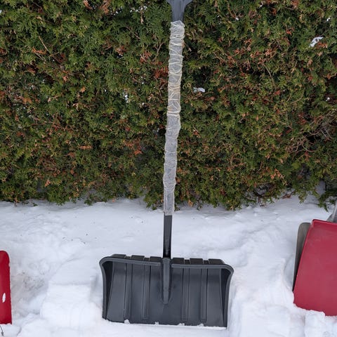 Sørlandsskuffe / Snøskuffe i rød metall, med metallhåndtak. Egnet for effektiv snørydding.