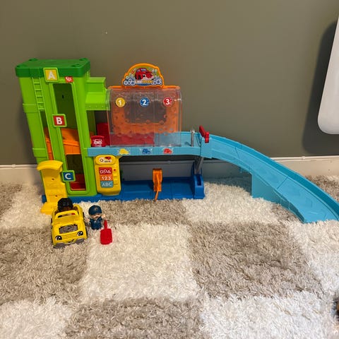 Fisher-Price lekesett med lastebil, rund «stein», figurer (2 stk) og heis. Lyd når heisen går opp og ned, og når bilen kjører over en fartsdump. (Lyd kan skrus av).