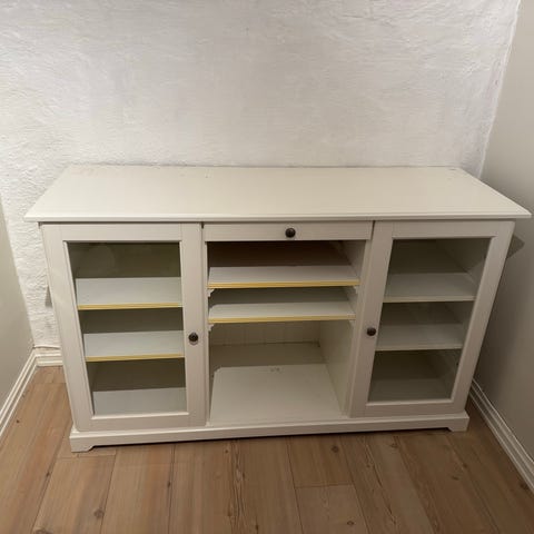 Dimensjoner oppgitt i annonsen, men det er i praksis to skap satt sammen (som kan splittes igjen, har ekstra føtter). Dermed kan bredde bli 70cm i stedet for 140.