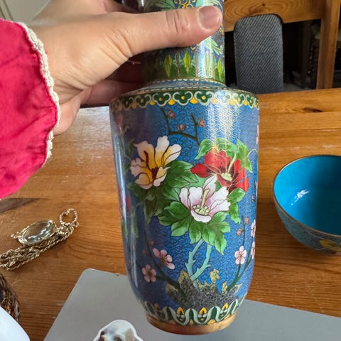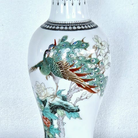 Elegant og iøynefallende stor vase i klassisk blå- og hvit stil. Vasen er rikt dekorert med tradisjonelle kinesiske landskapsmotiver med broer, paviljonger og natur, og har en vakker glasert finish.