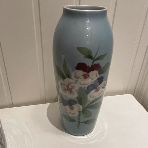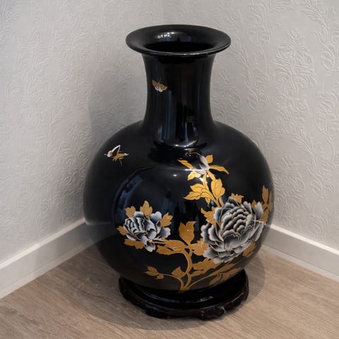 Passer perfekt som gulvvase, enten alene som et statement-objekt eller med kunstige/ekte planter. Står stødig på medfølgende mørk trefot som følger med.