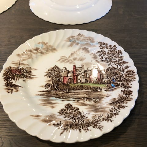 Selger et flott sett(eller enkeltvis) med seks frokosttallerkener fra det engelske merket Johnson Brothers, i det klassiske «Watermill»-mønsteret.
