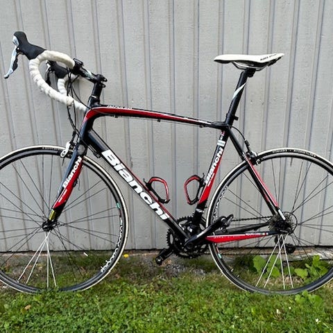 Den er utstyrt med Shimano Ultegra 10 delt gruppesett, med 105 framgir. Bremsene er Reparto Corse, altså Bianchis husmerke. Hjulene er aluminium clincher.