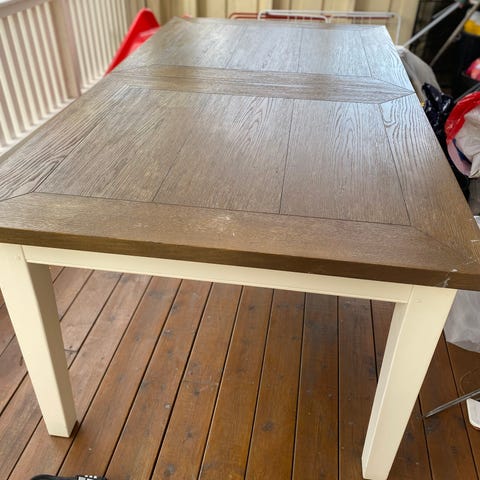 Selger et ovalt spisebord med ileggsplate i finer, og tilhørende stoler i merket Eidsvoll 152 x 112. Bordet er godt brukt med noe slitasje.