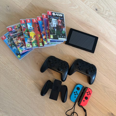 Defekt svart Nintendo Switch konsoll med to Joy-Con controllere, Pro-kontroller, dokkingstasjon, lader og oppbevaringsveske. (OBS!!! trenger reparasjon)