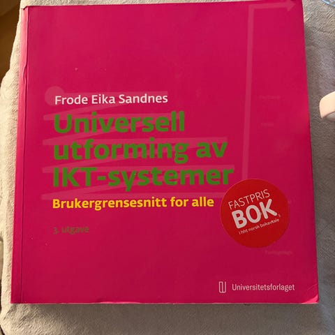 Universell utforming av IKT-systemer - brukergrensesnitt for alle skrevet av Frode Eika Sandnes. Pensum brukt i faget MMI menneske-maskin-interaksjon v/ OsloMet høst 25. Bruksmerker i form av overfladiske riper på perm og brett på innholdsfortegnelse. Ellers er sidene fine uten markeringer.