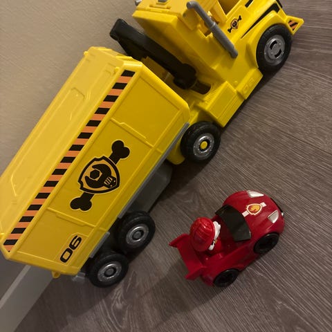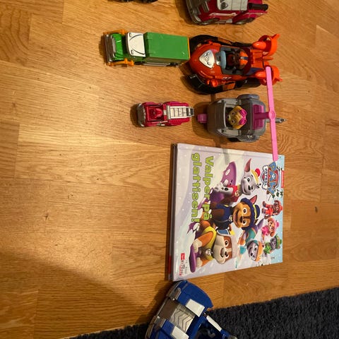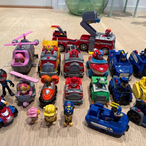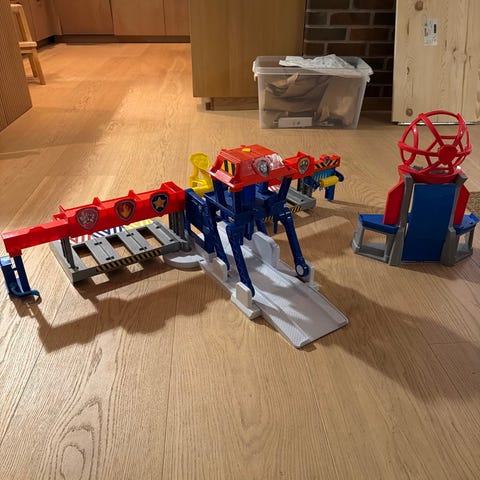Paw Patrol lekesett som inkluderer et tårn med spiralrampe og flere små biler i ulike farger og modeller. Noen biler har fått litt hard medfart, les andre ser helt nye ut.