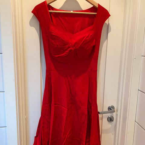 Selger en rød kjole med kort arm. Brukt noen få ganger. Myk og behagelig. Tynt stoff med noe skjær i stoffet.