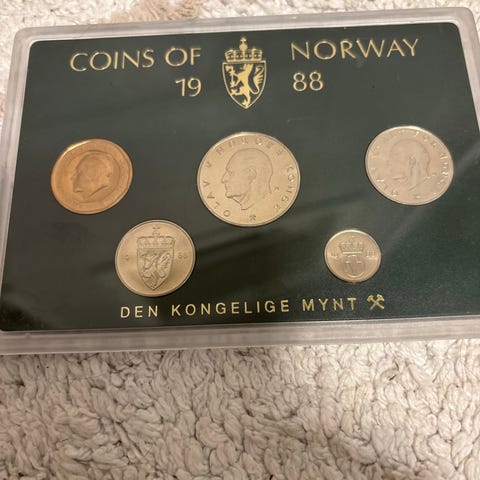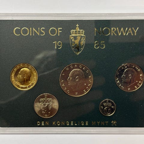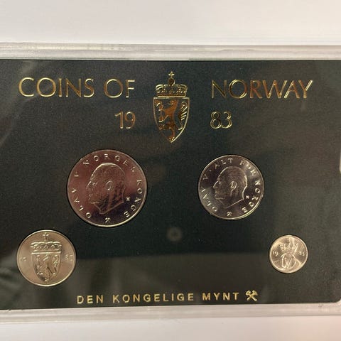 Den Kongelige Mynt myntsett med mynter fra Norge, år 1983. Settet inneholder flere mynter med ulike valører, presentert i original emballasje som viser detaljer om myntene.
