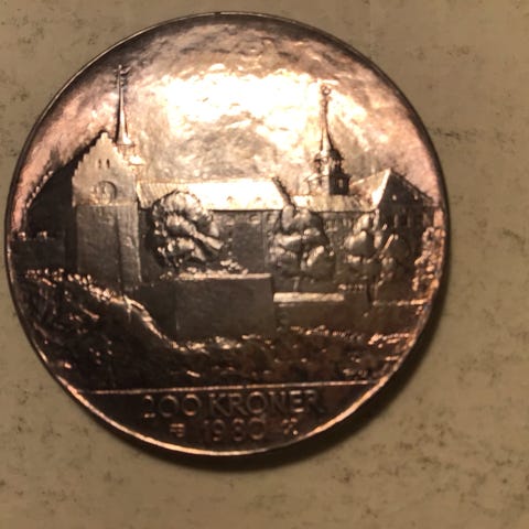 Coins of Norway myntsett fra 1985 med flere mynter i ulike størrelser og materialer. Settet inneholder mynter med forskjellige diametre og vekt, inkludert mynt med gullfarge og andre i sølvfarge. Myntene er utstedt av Den Kongelige Mynt.