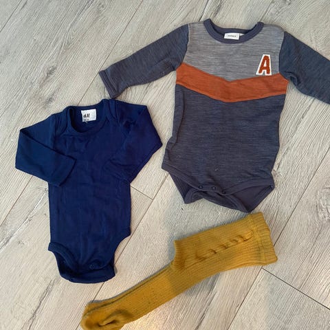 To stk strømpebukser som jeg tror er i str 68/74. Lappen er klippet av, men ser slik ut sammenlignet med andre plagg ☺️ begge to har ca 50% ull i seg.