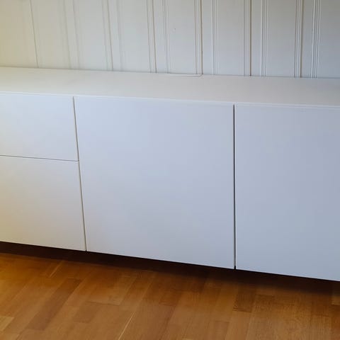 Godt brukt tv-benk fra IKEA, med to skuffer og hyller i midten. Trengs et lag maling/nye dører. Kan også brukes uten dørene.