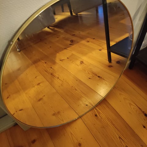 Rundt speil med integrert LED-belysning rundt kanten. Passer til baderom eller andre rom som krever et funksjonelt og dekorativt speil. Speilet lyser ikke, må fikses om man vil ha lys i det.