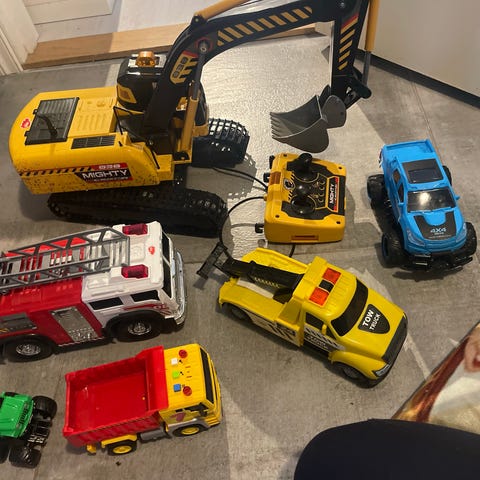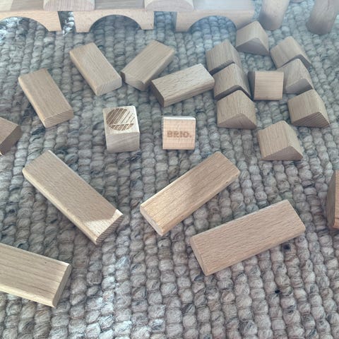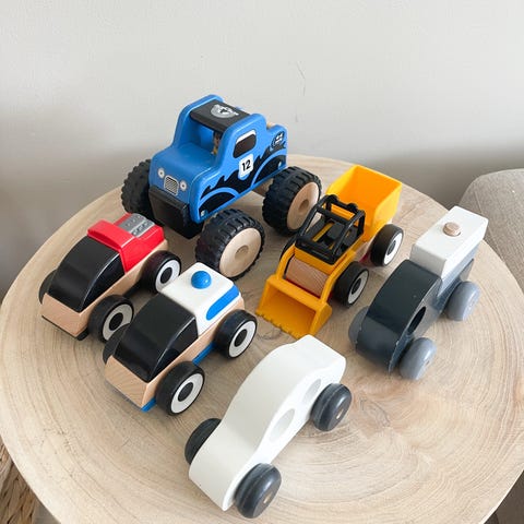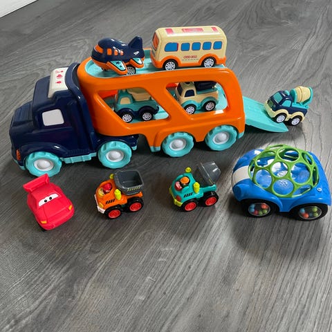 BRIO lekebiler laget i tre. Settet inkluderer en grønn traktor med en lasteskuffe, en liten figur og en eske, samt en oransje og grønn bil med klosser som kan stables. Klossene og bilen har magnet som gjør det kjekkere å stable. Selges for kr 60 pr stykk.