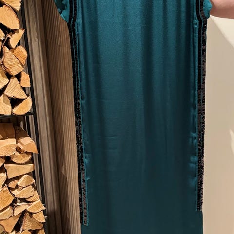 Unik, tøff og behagelig kjole fra Anna Sui. Str 4 = 38. Nydelige grønnfarger. Nydelig stoff og lysegrønt innerfôr. Fine detaljer. Brukt 1 gang.