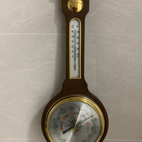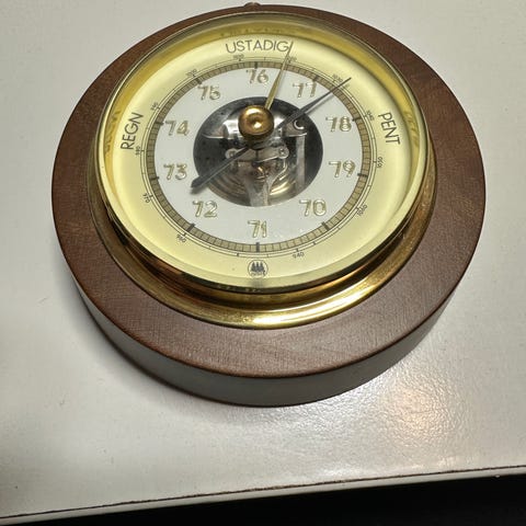 Vintage veggbarometer i tre og messing. Mekanisk, fungerer fint. Klassisk nordisk design.