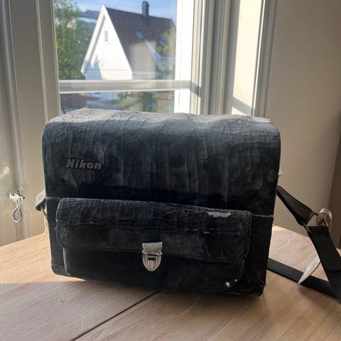 Sekken er godt brukt og har slitasje, men fungerer fortsatt til de som trenger en enkel sekk for å ha kamerautstyr i. Glidelås kan henge seg litt opp