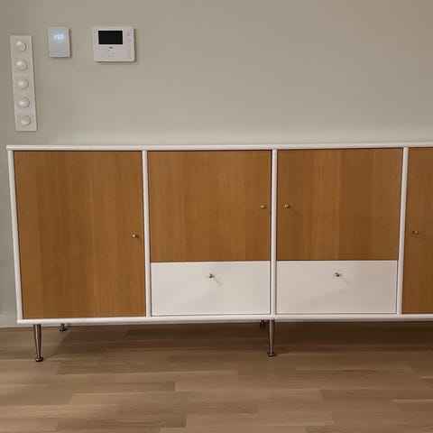 Luxe skjenk fra Bolia selges. Svartbeiset oljet eik, finér. Håndtak i messing. Et par små bruksmerker (se bilde), men de er så vidt synlige.