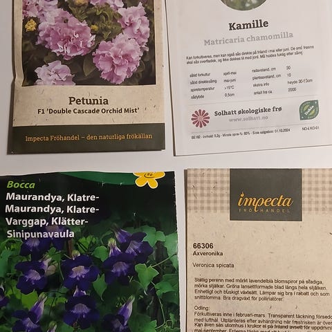 Tomatfrø fra egen hage selges for 20 nok per sorte. Ca 20-25 frø i pose.
