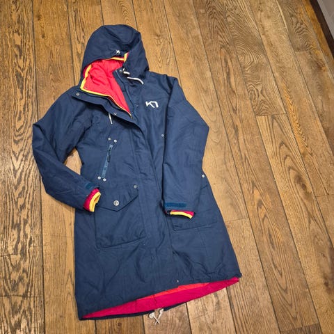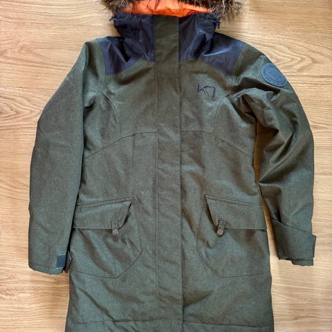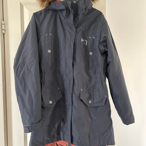 Kari Traa parkas størrelse M for kvinner. Jakken er grå og laget av polyester. God allsidig jakke for kjørlige dager