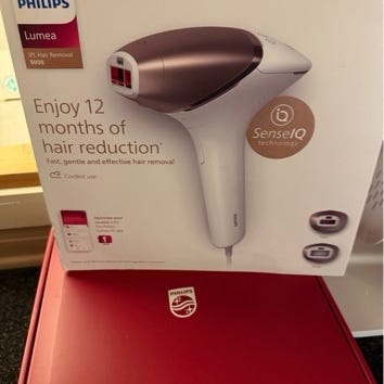 Philips Lumea IPL hårfjerningsapparat i hvit farge. Inkluderer apparat, to utskiftbare hoder, lader og bruksanvisning. Designet for hjemmebruk med IPL-teknologi for hårfjerning.