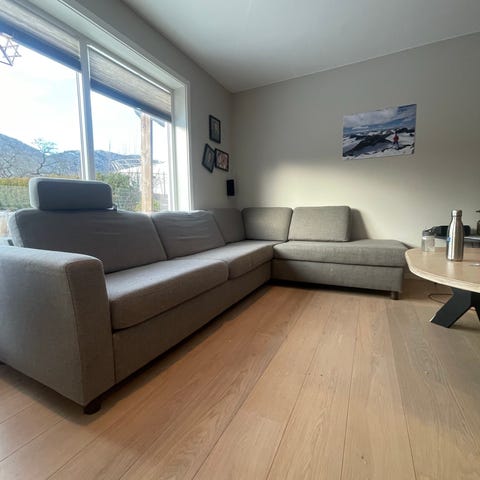Det jeg tror er en cleveland hjørnesofa fra Skeidar kjøpt i 2018. Grå. Trenger en god runde med tekstilrenser og litt nuppefjerning. Gis bort asap.