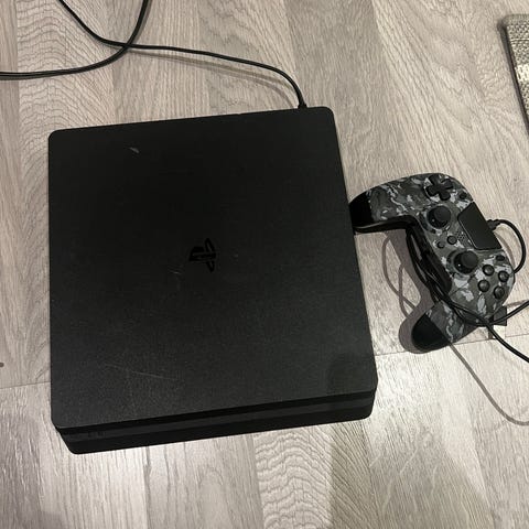 Sony Playstation 4 spillkonsoll med 500 GB lagringskapasitet i svart farge. Konsollen er designet for hjemmeunderholdning og spill, kompatibel med Playstation 4-spill.