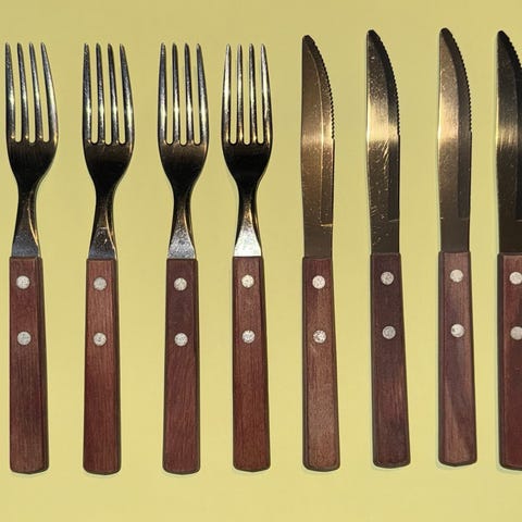 Søkeord: kniv gaffel girl gafler kniver kjøkken kjøkkenutstyr utstyr redskap bestikk biff biff-bestikk håndtak tre rustfri rustfritt wood steel biffgafler biffbestikk