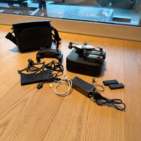 DJI Mavic Pro drone med kamera og flere ekstra propeller. Inkluderer lader, bæreveske og diverse tilbehør for dronebruk.