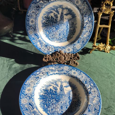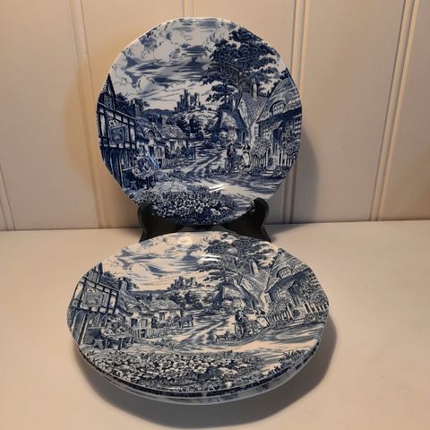 To dype tallerkener til suppe ( h: 3,5cm d: 22cm) og en asjett ( d: 17,6 cm) fra den engelske Enoch Wedgwood / Loch Awe serien til salgs.