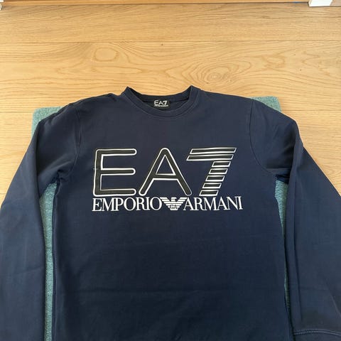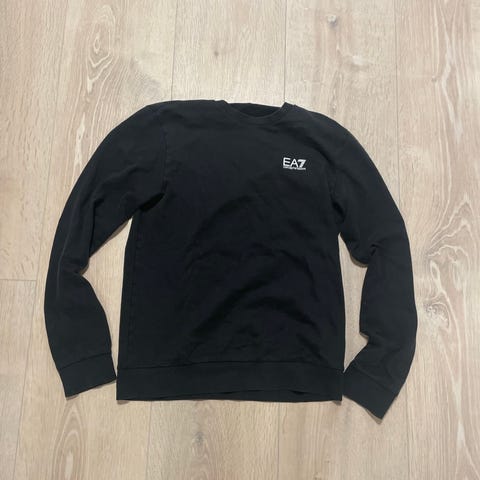 Armani EA7 genser i hvit farge, laget av bomull. Herremodell i størrelse L. Genseren har logo på brystet og dekorative detaljer på ermene.