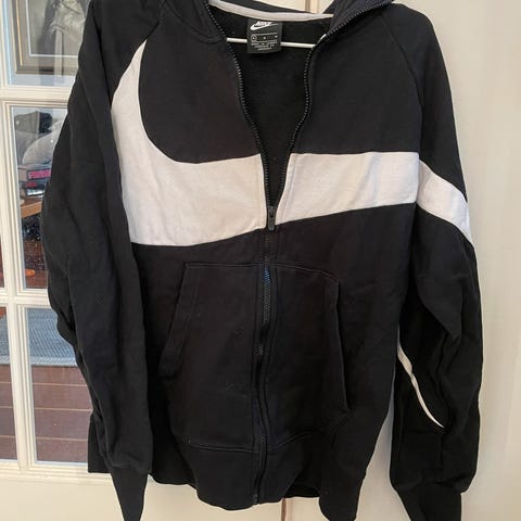 Nike hettejakke i størrelse M, laget av bomull. Jakken har hette og glidelås, og er grå i fargen.