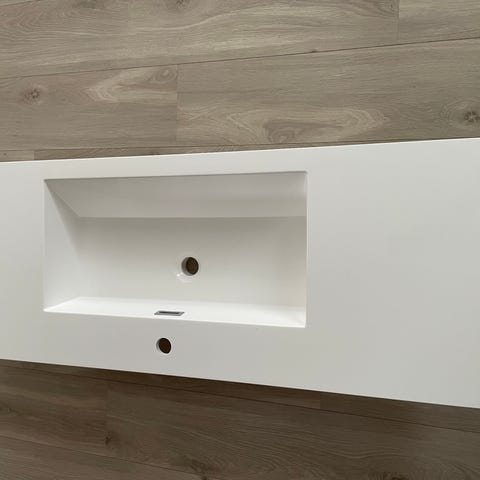 Baderomsmøbel med servant, armatur og blandebatteri. Står på et soverom, var her da vi flyttet inn, nesten ikke brukt. Usikker på hvor det er fra, men armaturet er hansgrohe. To skuffer, to bein. Svart, med grå fronter, og en grønn / blå servant i glass. Noen kalk-flekker som kan skrubbes vekk.