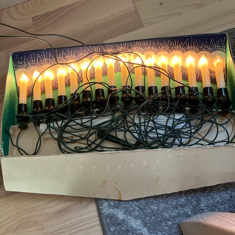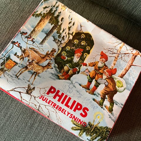 Historie: Elektrisk juletrebelysning ble vanlig i Norge etter andre verdenskrig, og Philips var en av hovedprodusentene. Lysene som kom i disse eskene var ofte 16- eller 10-lysserie med fargede sokler eller klare pærer.