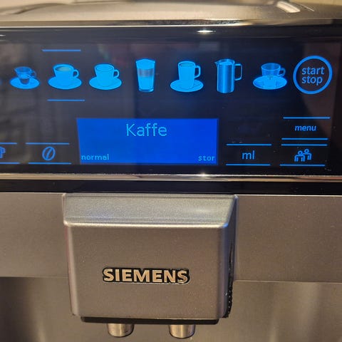 Kaffemaskinen har berøringsskjerm og moderne design i svart og stål, med stor vanntank på siden som er lett å åpne.