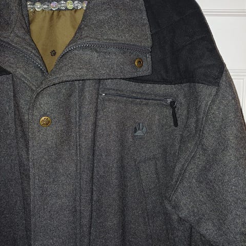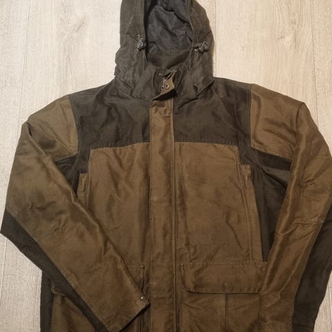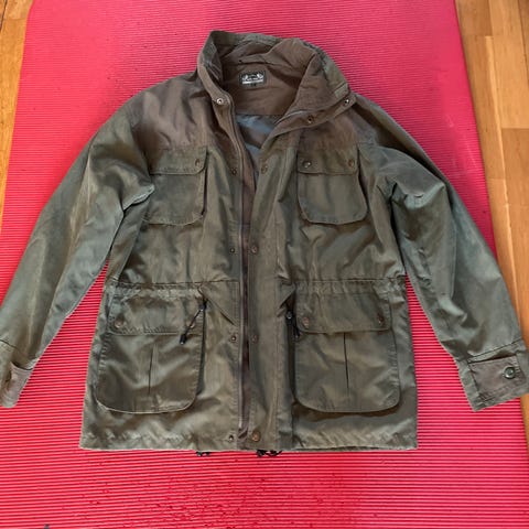 En gammel, men lite brukt jakke som er hel og pen i stoffet. Mangler hetta og strammestropp nederst på jakka. Strammestropp i midjen er der, noe slitasje på selve strikken.