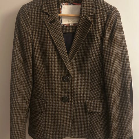 Selger en kjempefin blazer, kort i livet fra InWear i str 42/UK 16. Blazeren er i sort med gulltråder, og har skinn i sømmer/kanter. En helt nydelig jakke som er kjempefin over kjole, eller til skjørt og denim. Litt Chanel-stil/tweed. Litt liten i størrelsen synes jeg så den vil absolutt passe str 40, kanskje også en stor 38. Modell Shiloh.