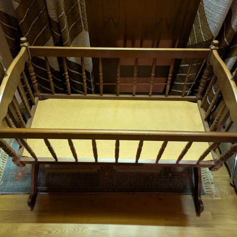 Nydelig monte vugge selges. Pent brukt. Ser helt fin ut, bortsett fra en liten «dent» i metallet. Se bilde.