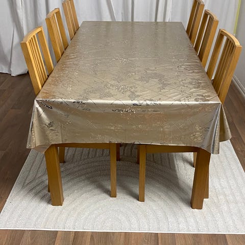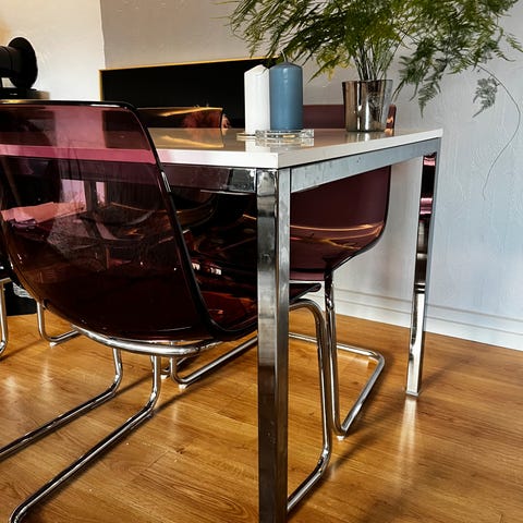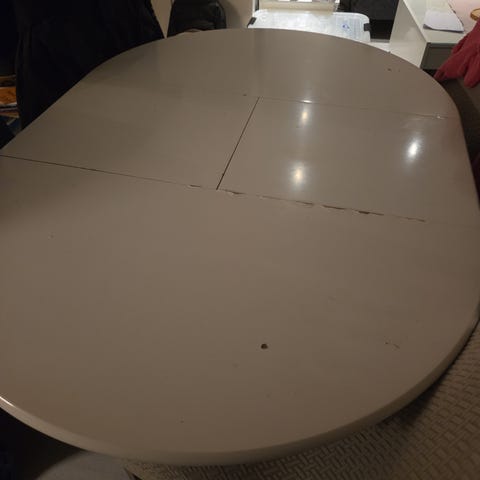 Er merker på overflaten (som vist på bildene) fra tidligere eier. Kan nok males over. Ene stolen mangler knott under beinet.