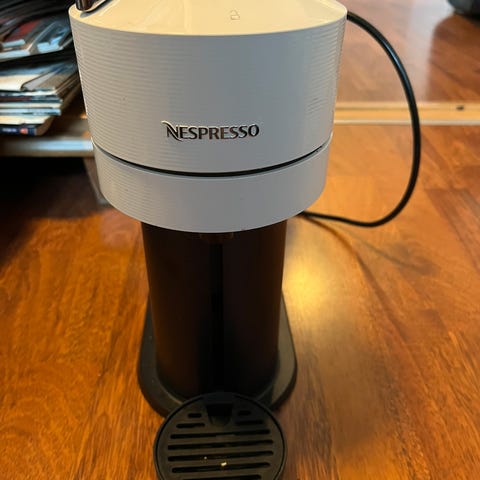 Nespresso Vertuo kaffemaskin i svart og hvit farge. Maskinen er designet for å bruke Nespresso Vertuo kapsler og har en vanntank på baksiden. Veldig lite brukt.